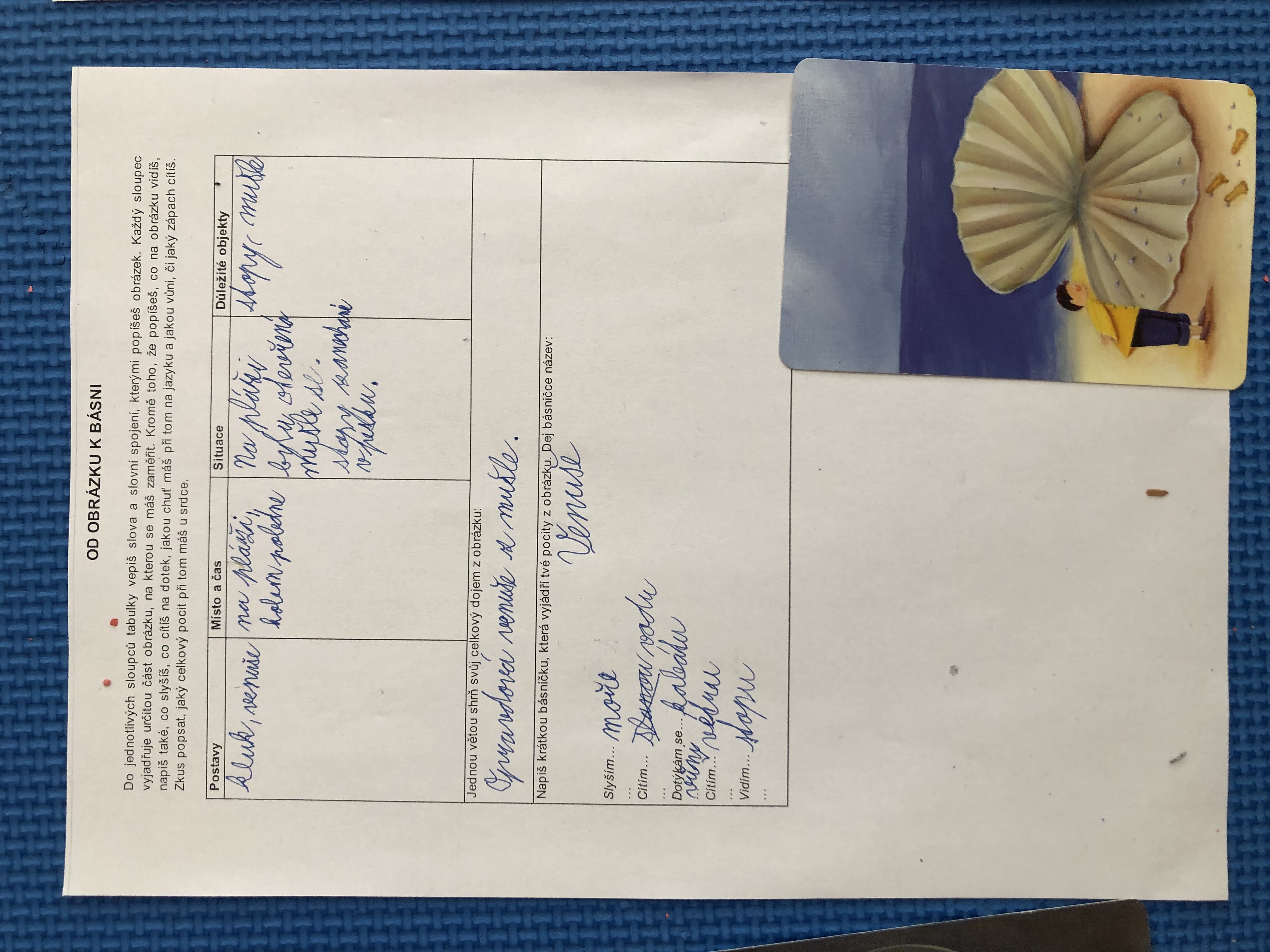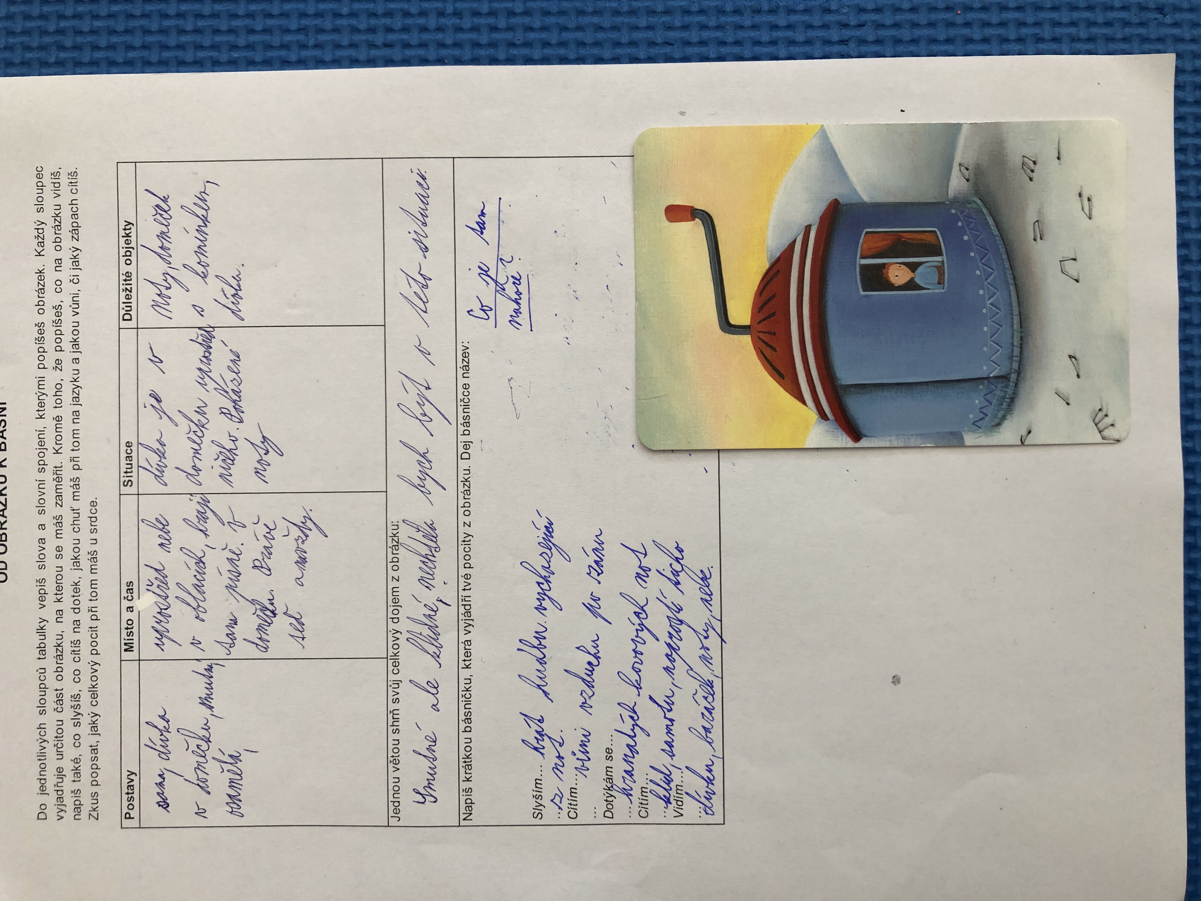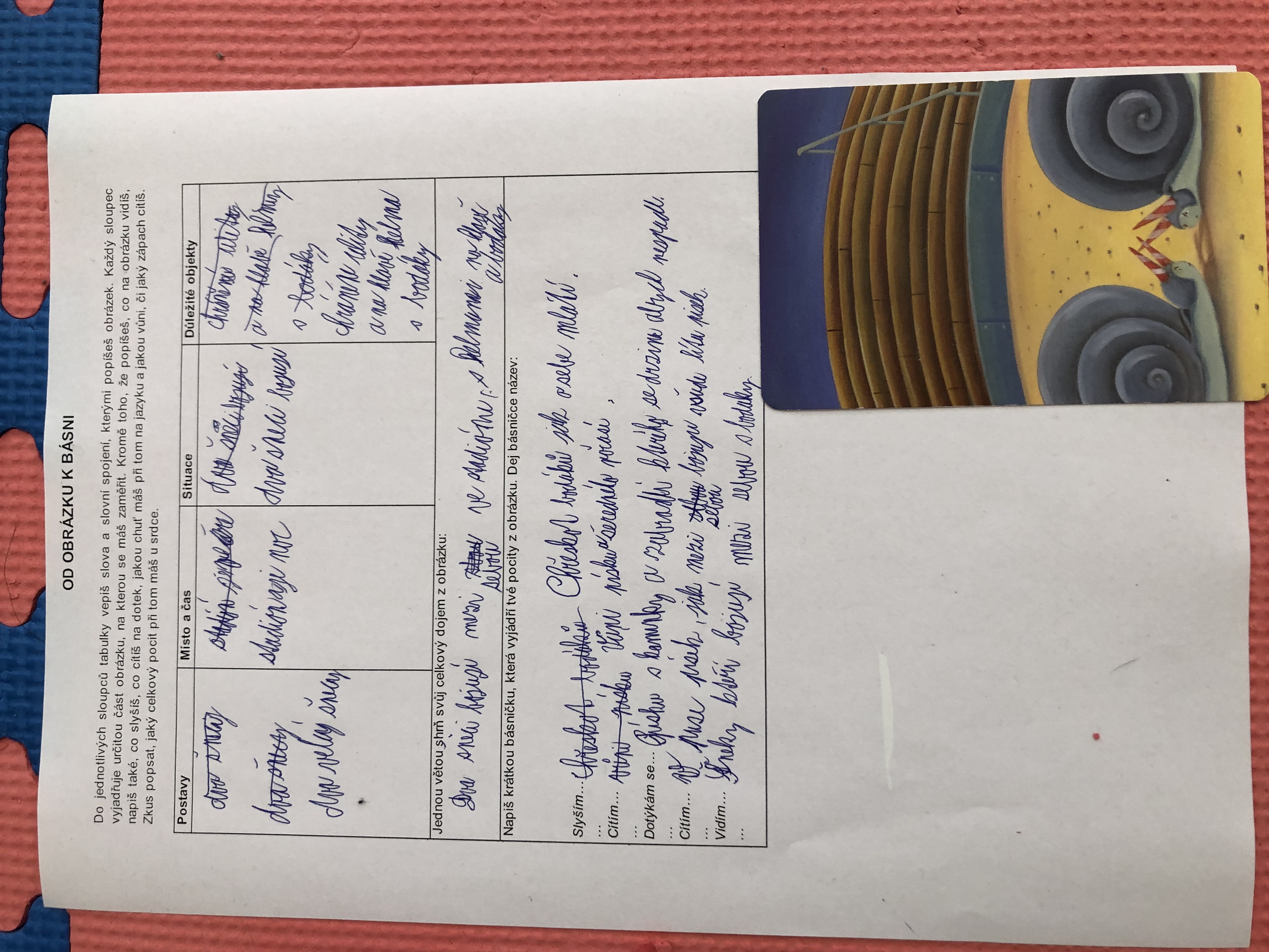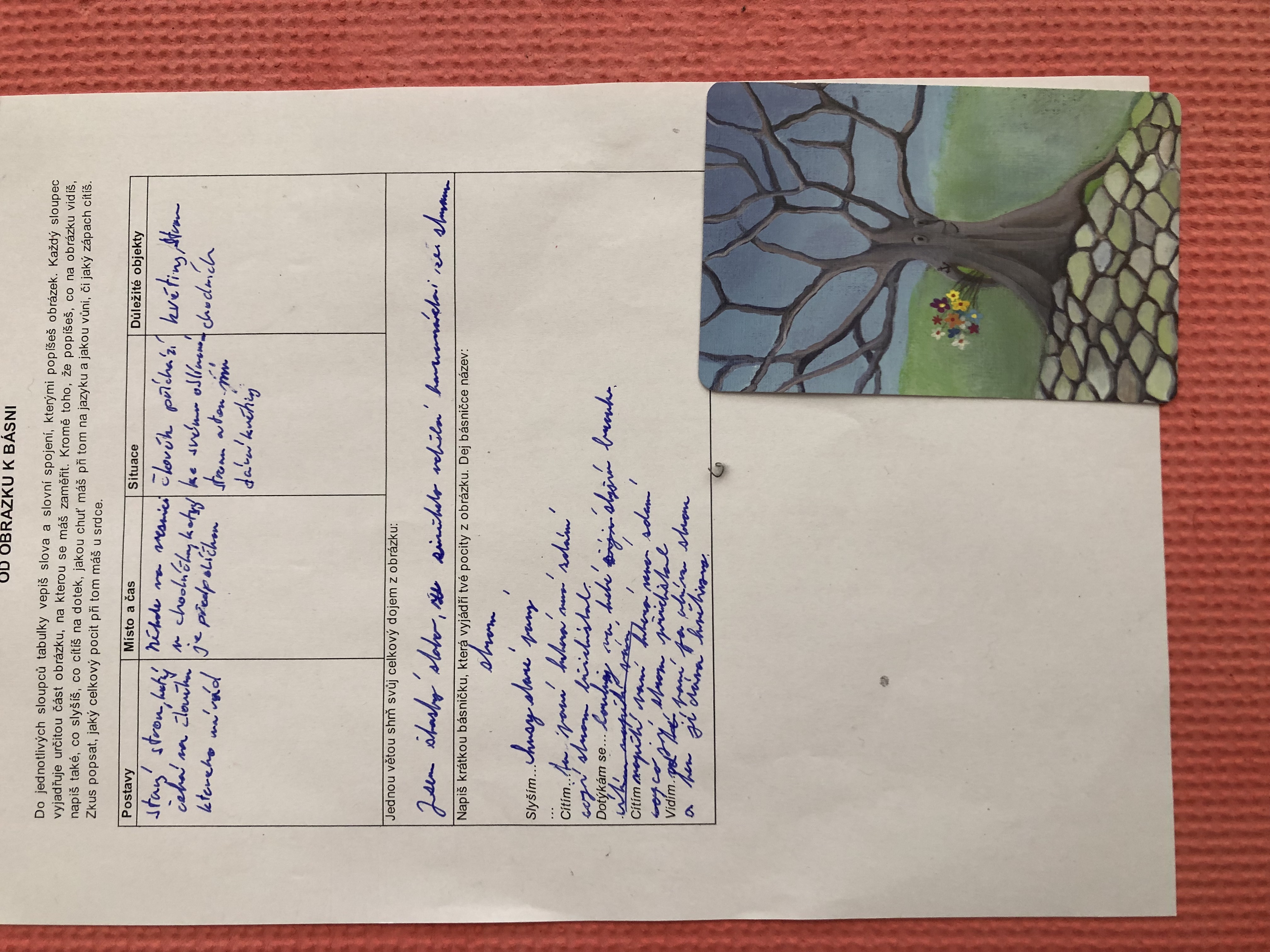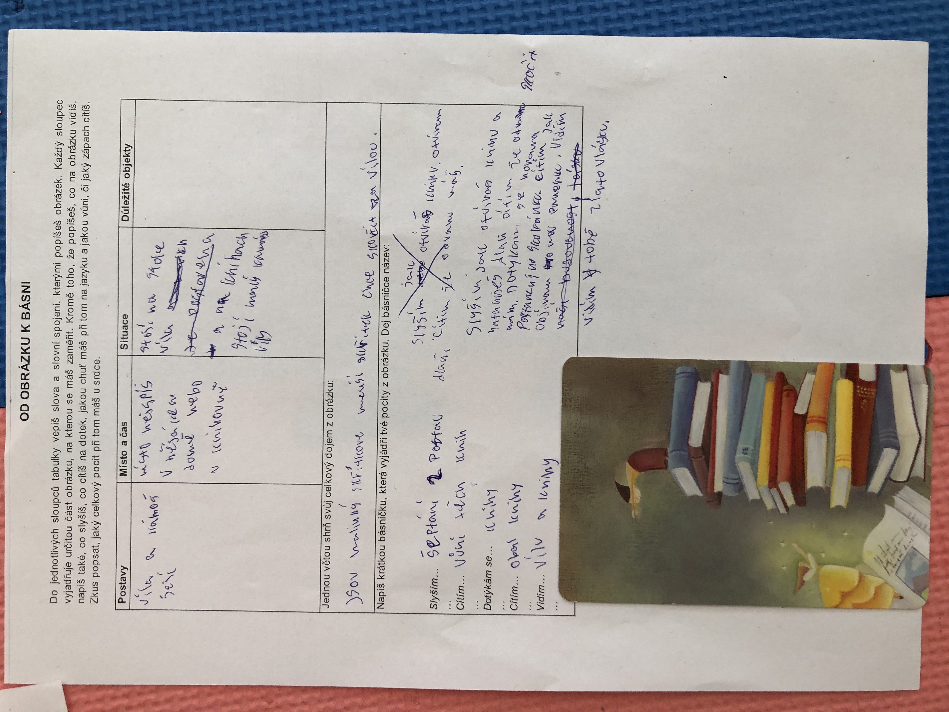 Nejen v dílně psaní děti píšou své texty, pisatelství se věnujeme i v dílnách čtení. Tentokrát se 7. B vydala na cestu od obrázku k básni. Každý si vylosoval obrázek a pokusil se zapojit všechny smysly: Postupně popsal jednotlivé části obrázku, představy si zapisoval do tabulky. Přemýšlel, jaký dojem v něm vyvolává, myšlenky zformuloval do věty. Následně vznikly krátké básničky...