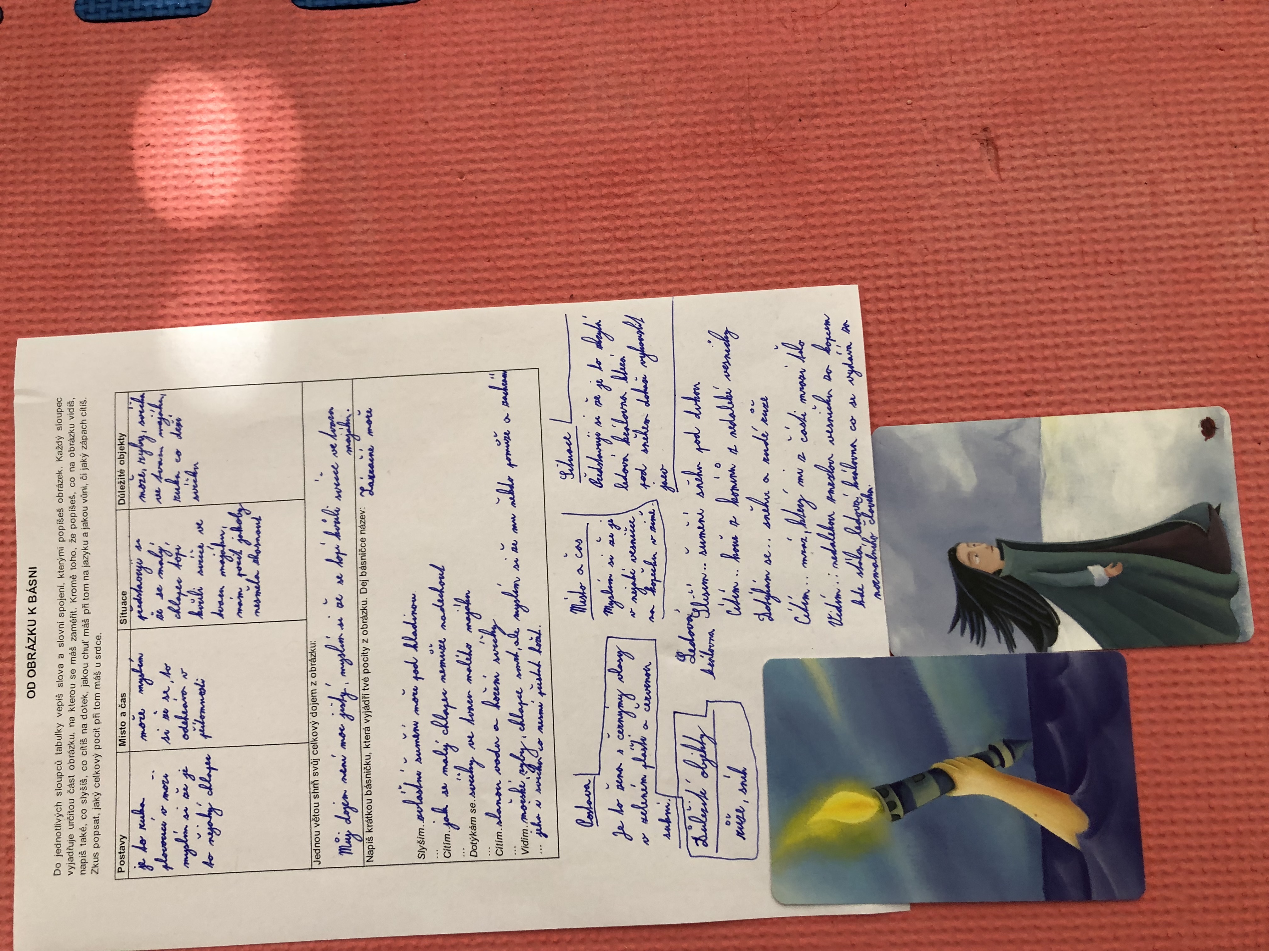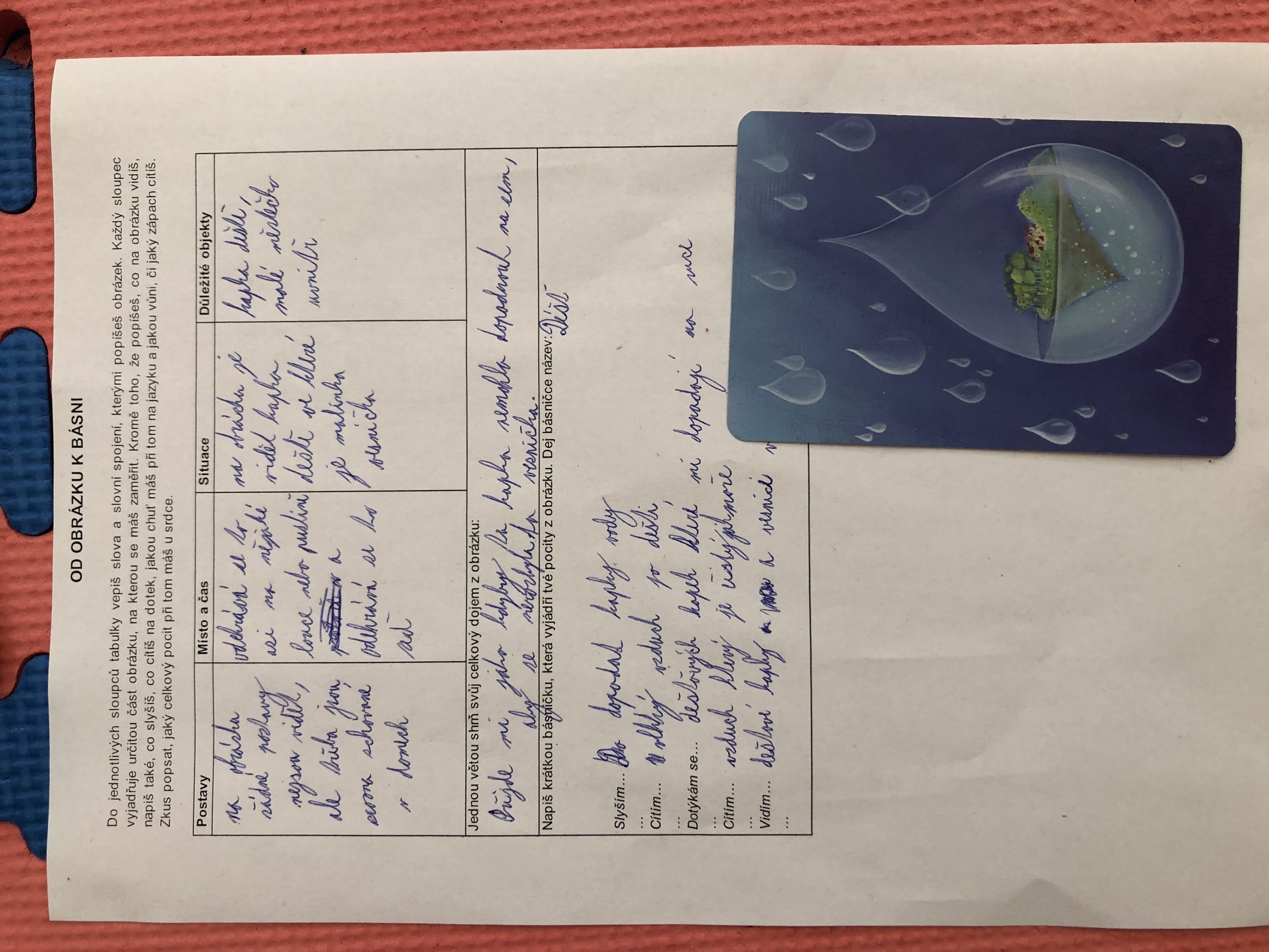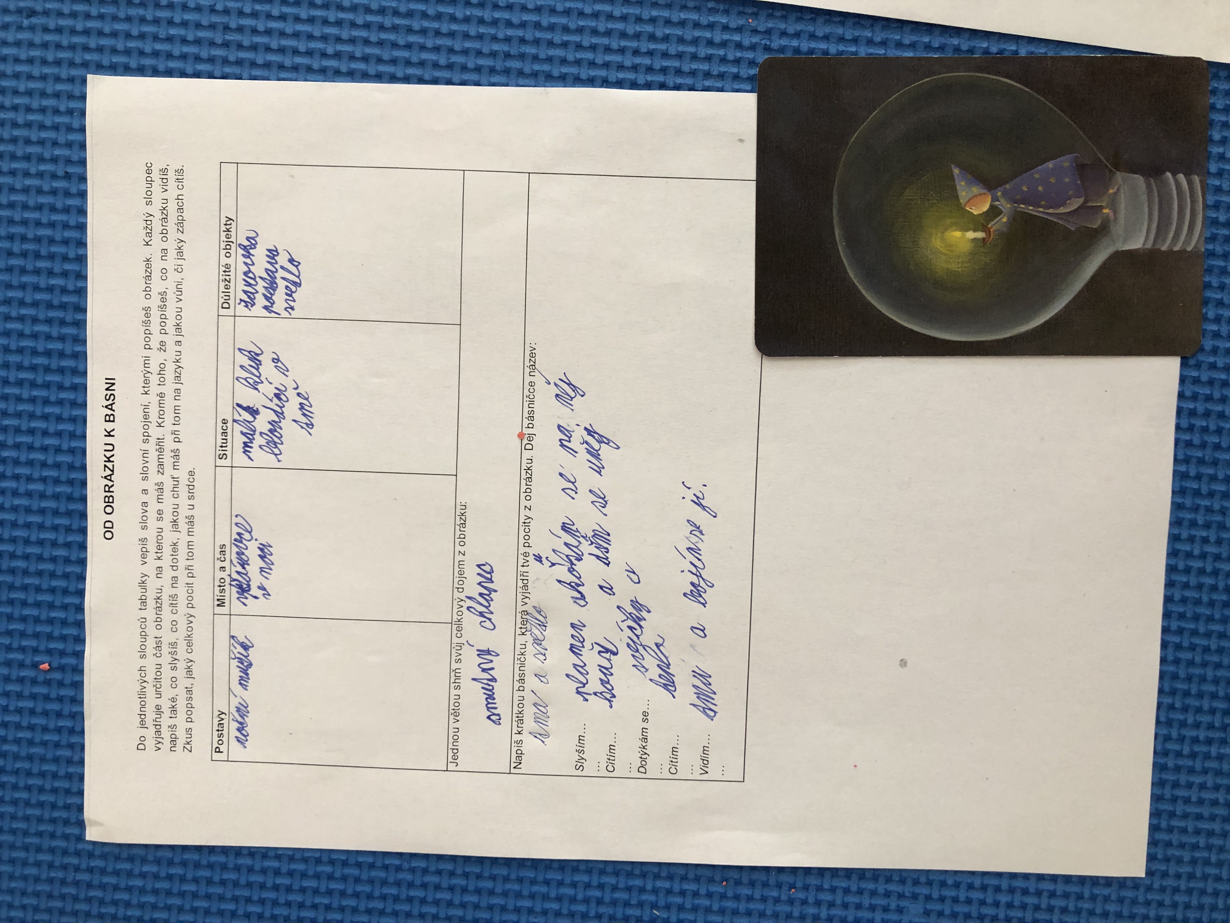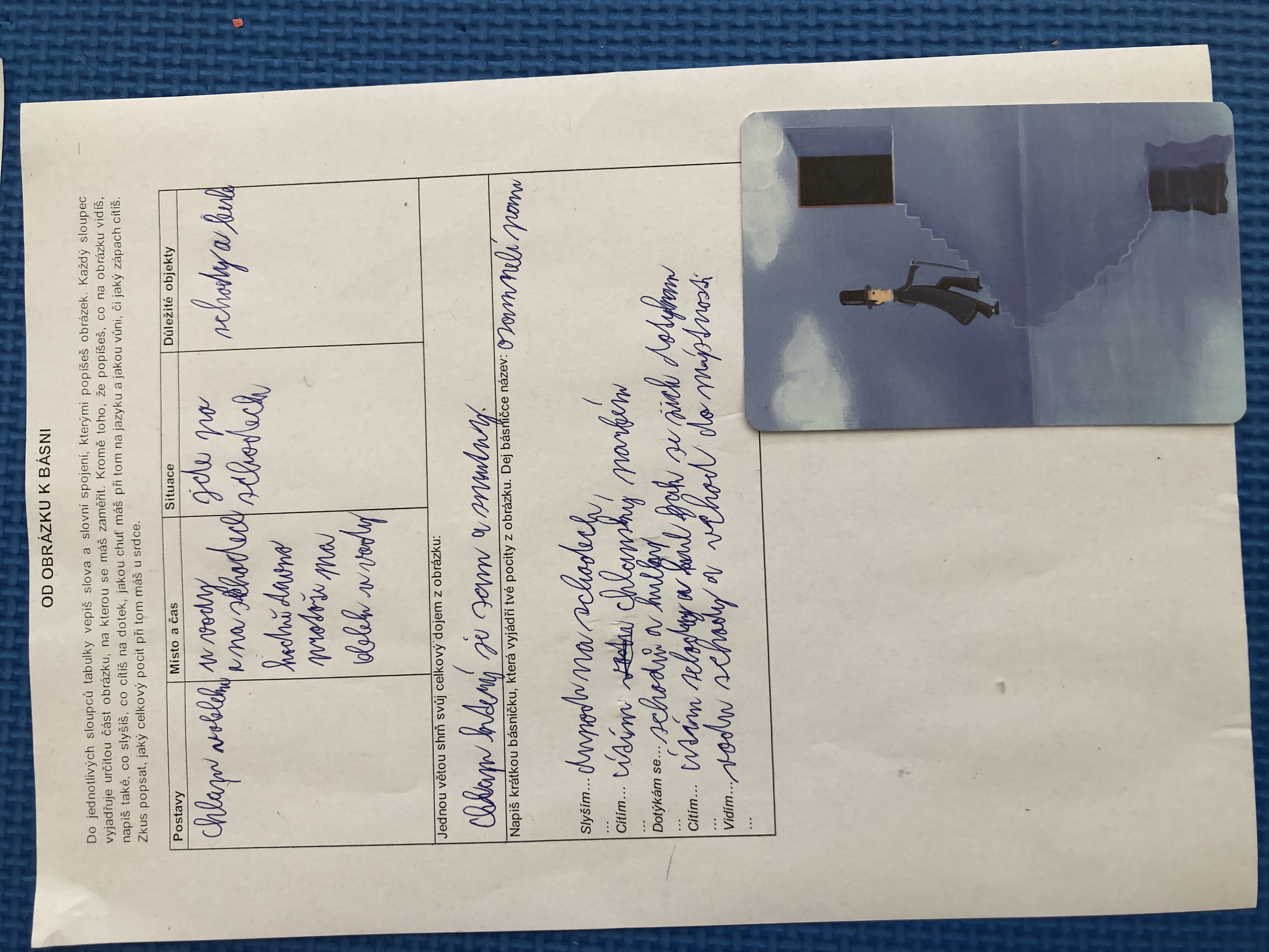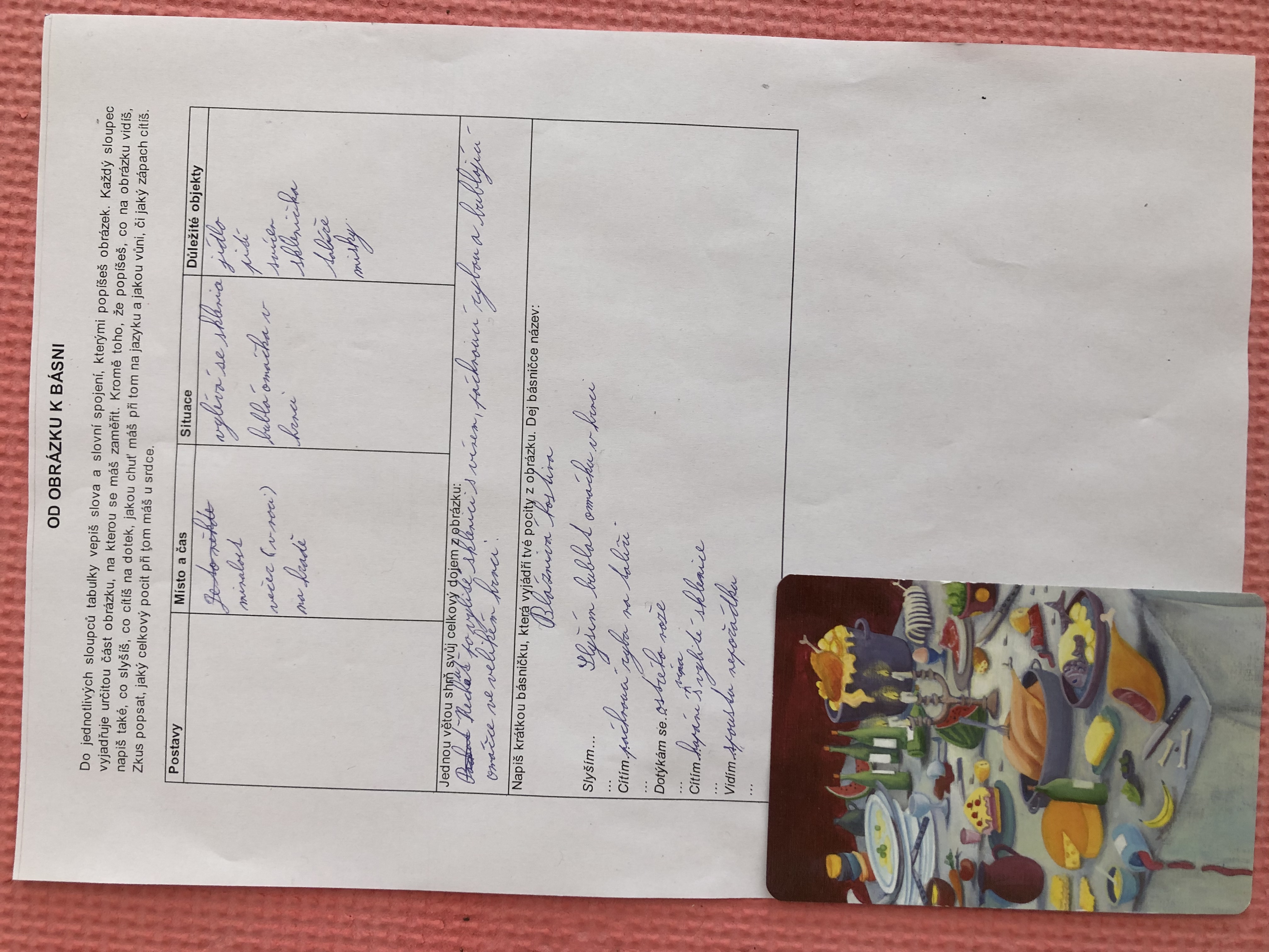 Nejen v dílně psaní děti píšou své texty, pisatelství se věnujeme i v dílnách čtení. Tentokrát se 7. B vydala na cestu od obrázku k básni. Každý si vylosoval obrázek a pokusil se zapojit všechny smysly: Postupně popsal jednotlivé části obrázku, představy si zapisoval do tabulky. Přemýšlel, jaký dojem v něm vyvolává, myšlenky zformuloval do věty. Následně vznikly krátké básničky...