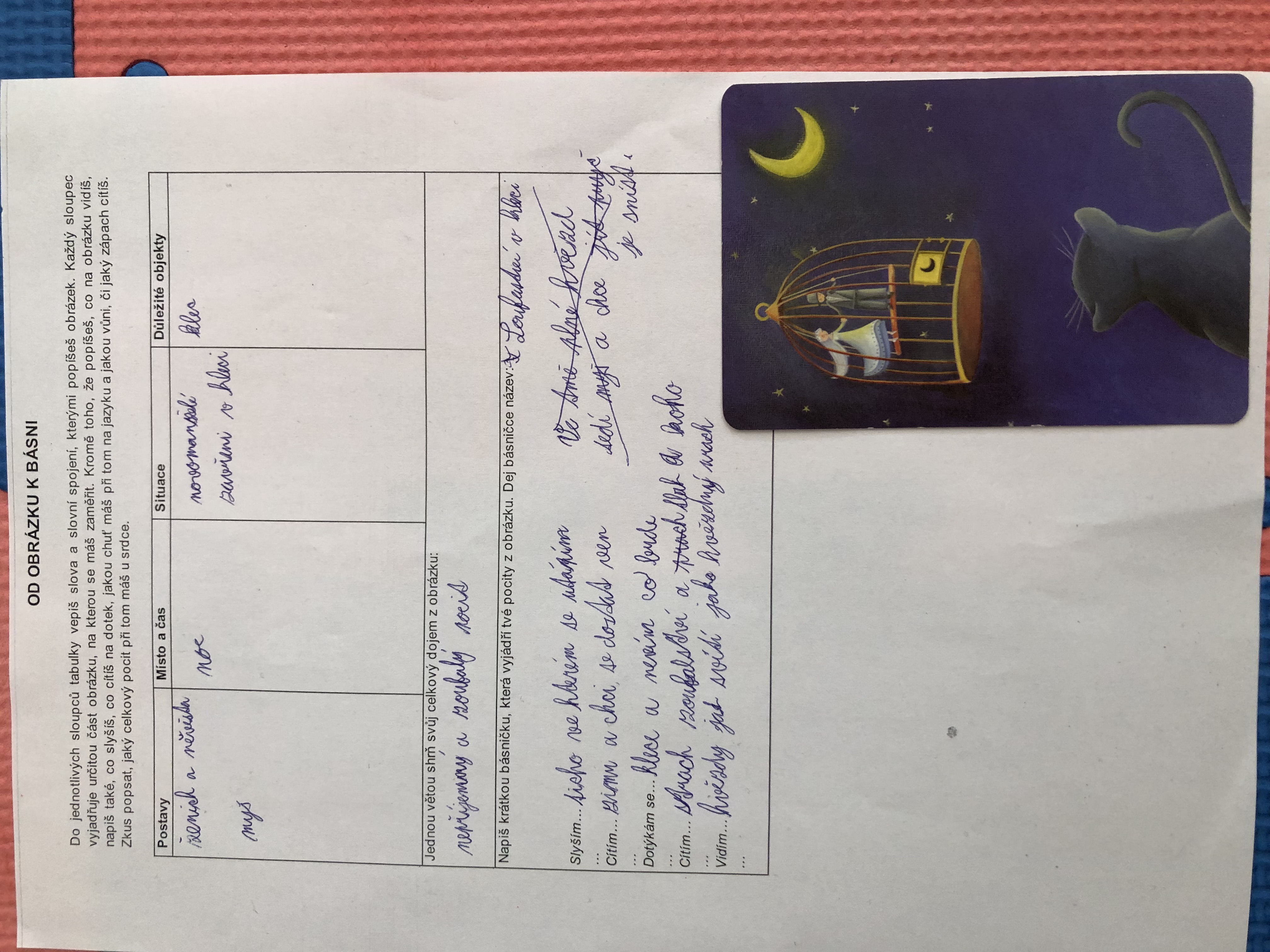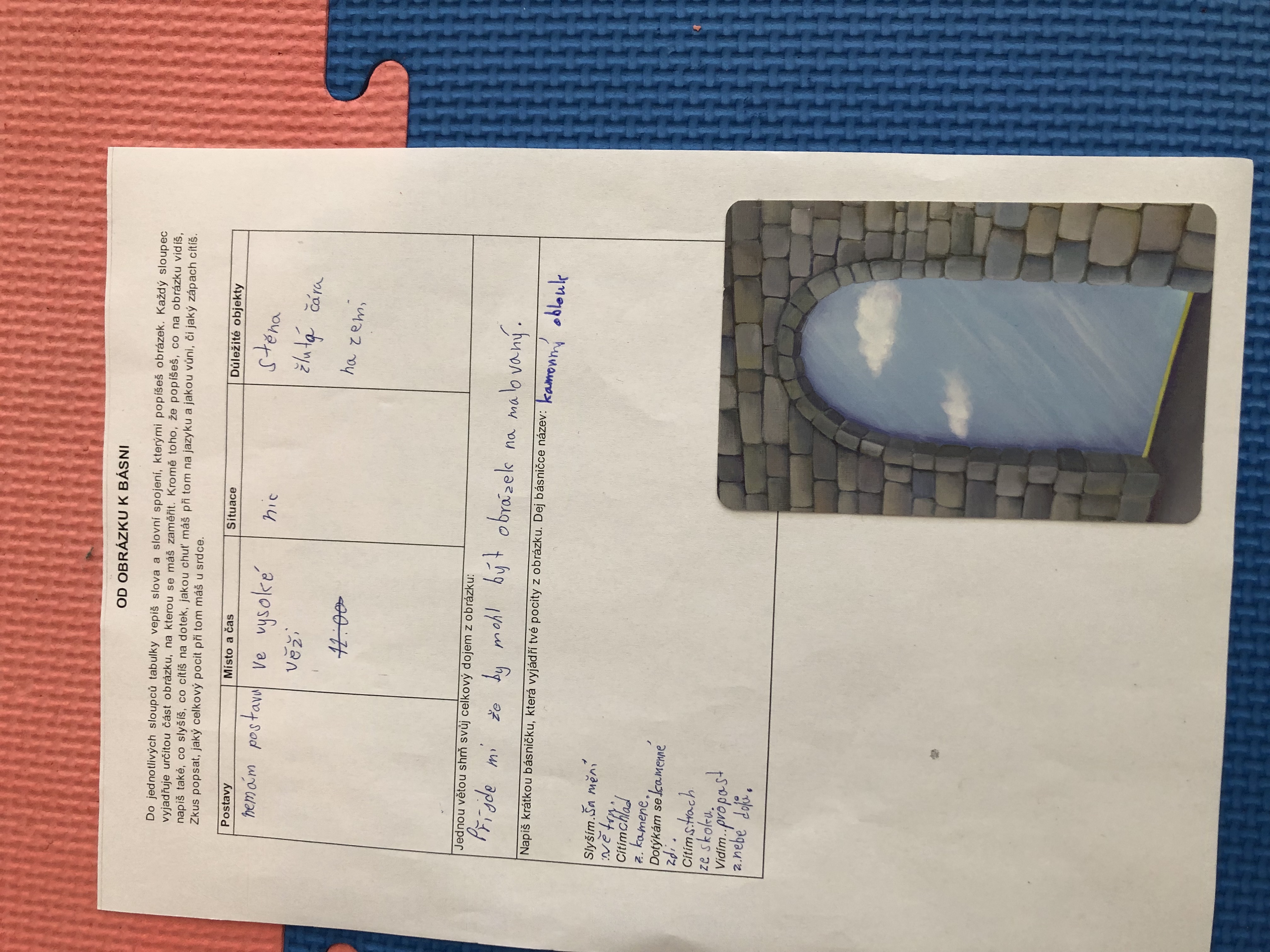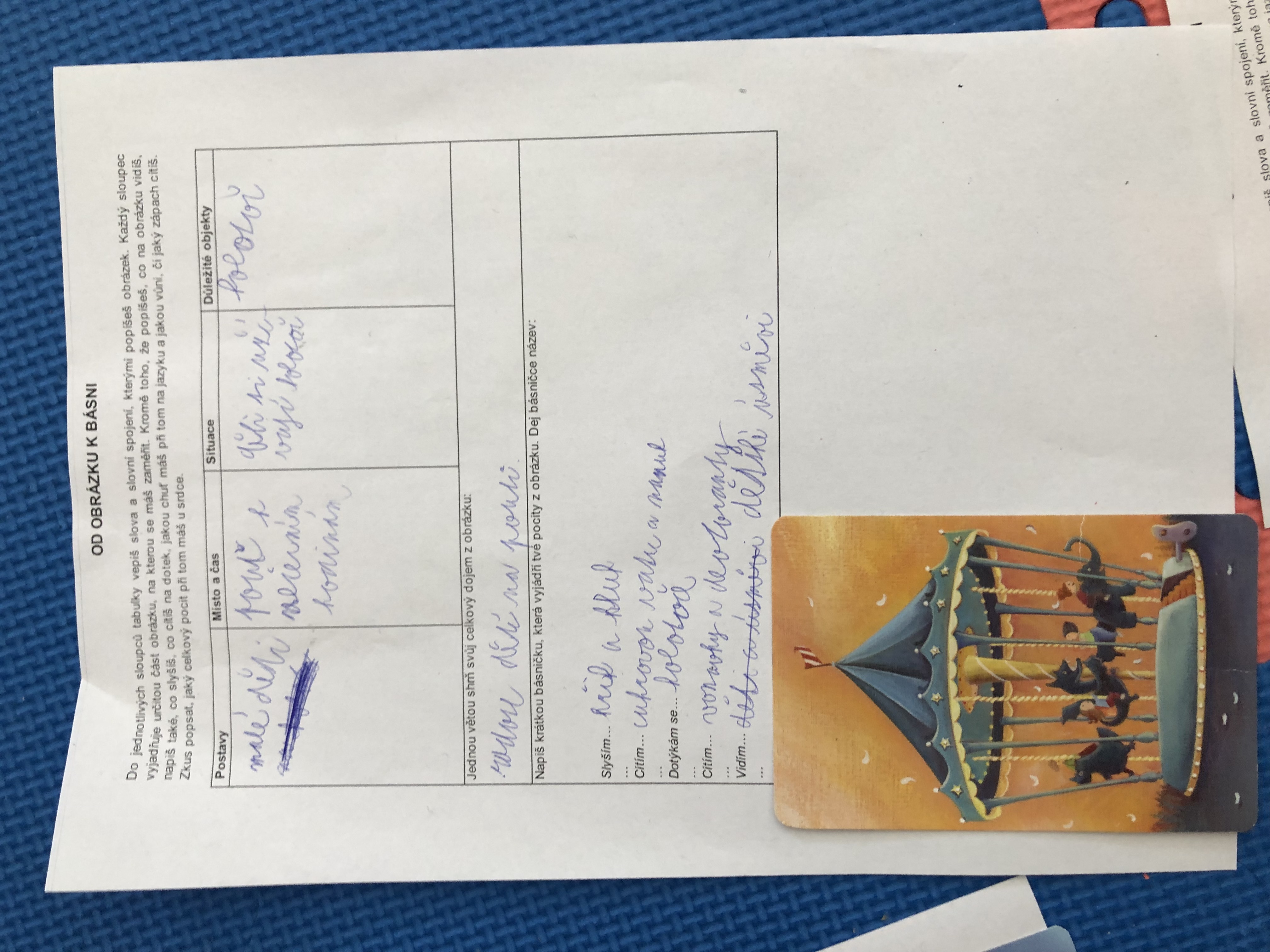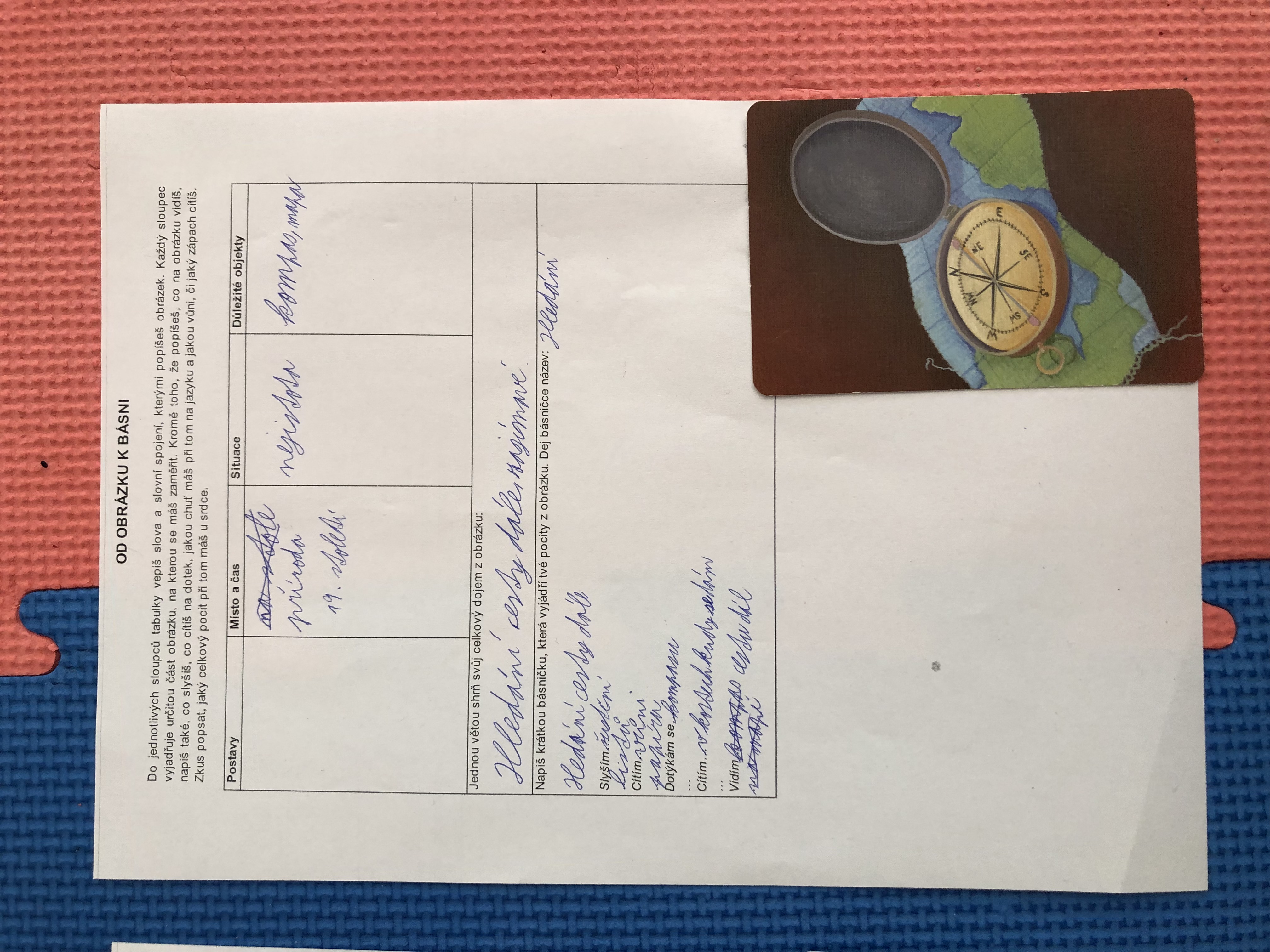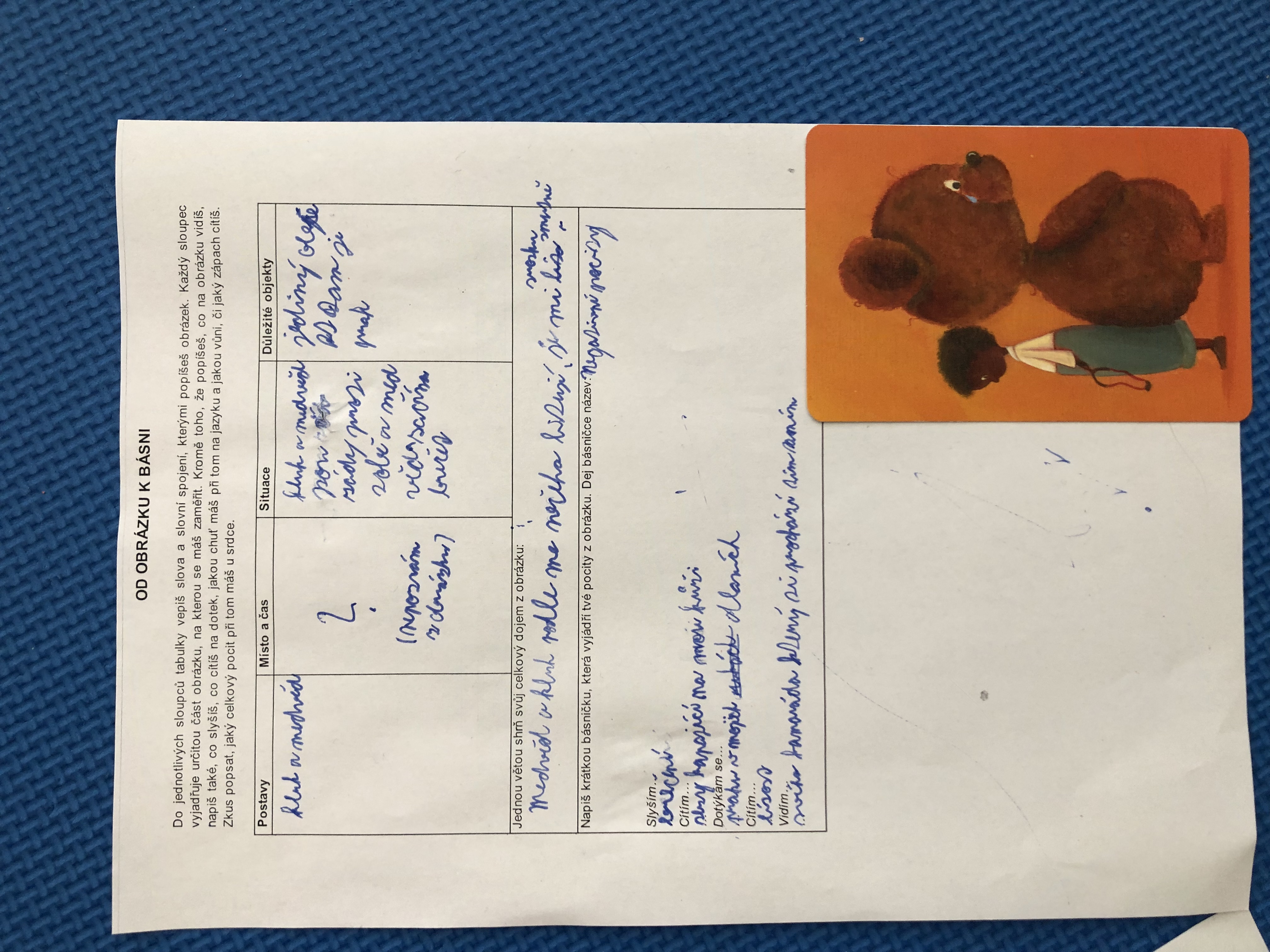 Nejen v dílně psaní děti píšou své texty, pisatelství se věnujeme i v dílnách čtení. Tentokrát se 7. B vydala na cestu od obrázku k básni. Každý si vylosoval obrázek a pokusil se zapojit všechny smysly: Postupně popsal jednotlivé části obrázku, představy si zapisoval do tabulky. Přemýšlel, jaký dojem v něm vyvolává, myšlenky zformuloval do věty. Následně vznikly krátké básničky...