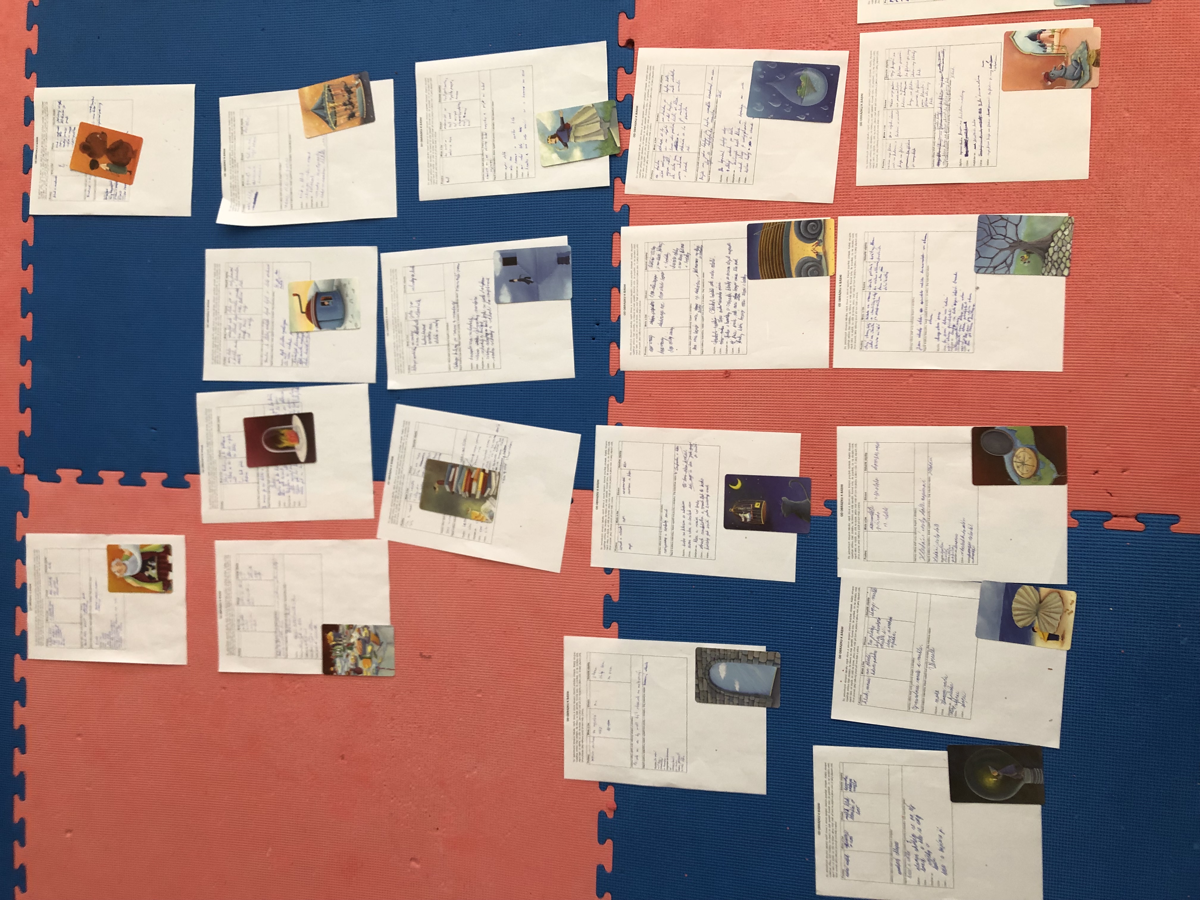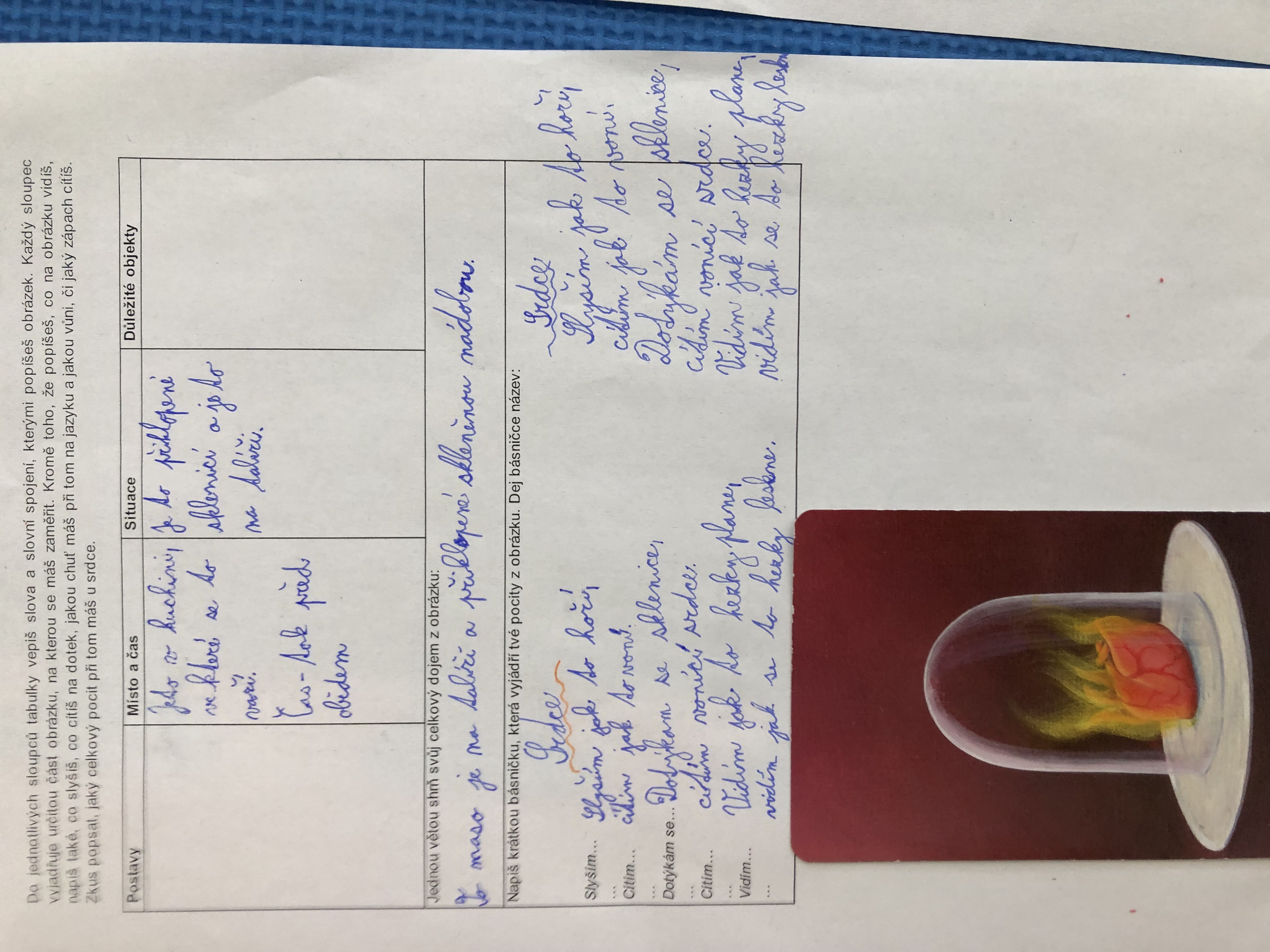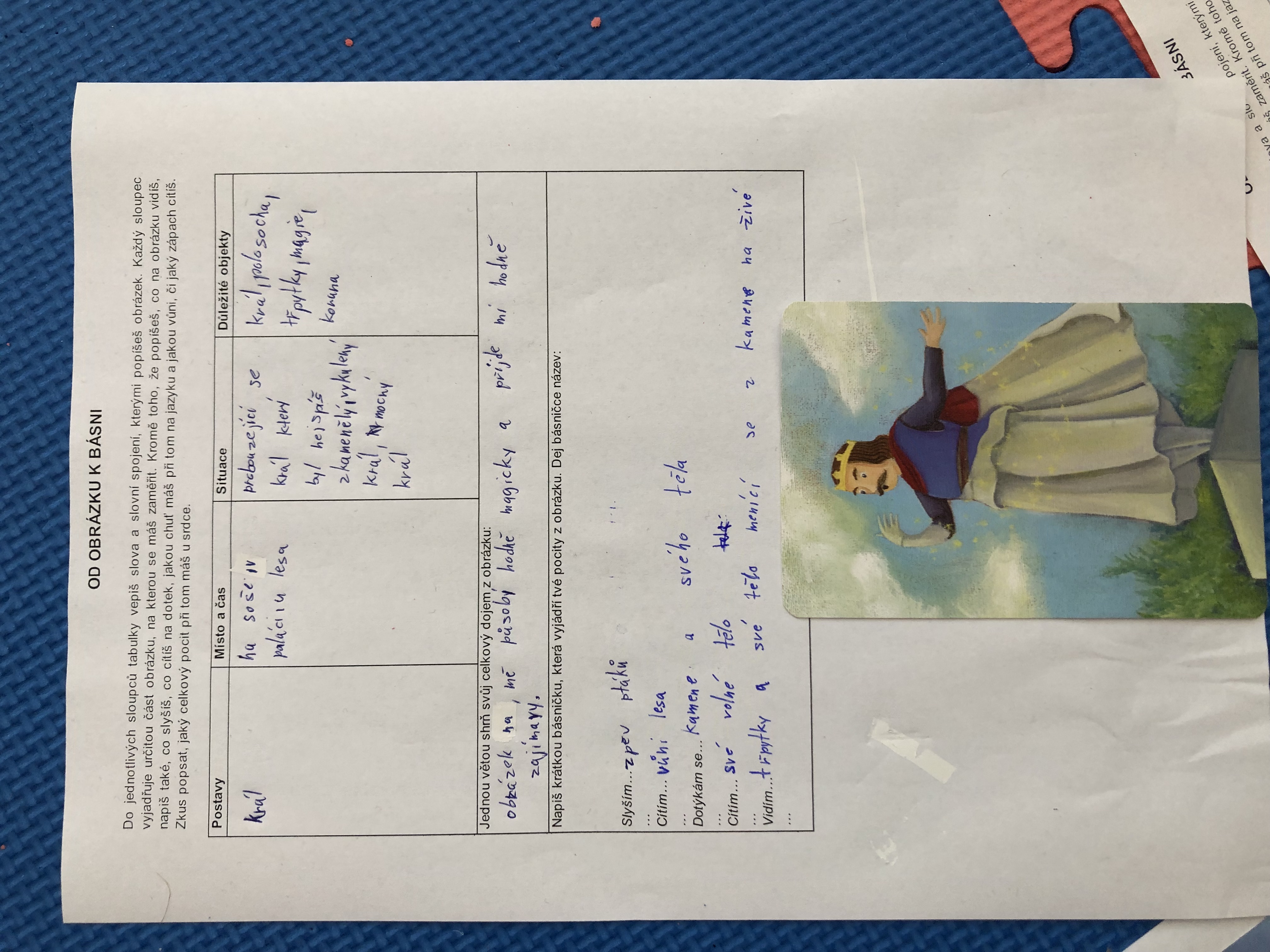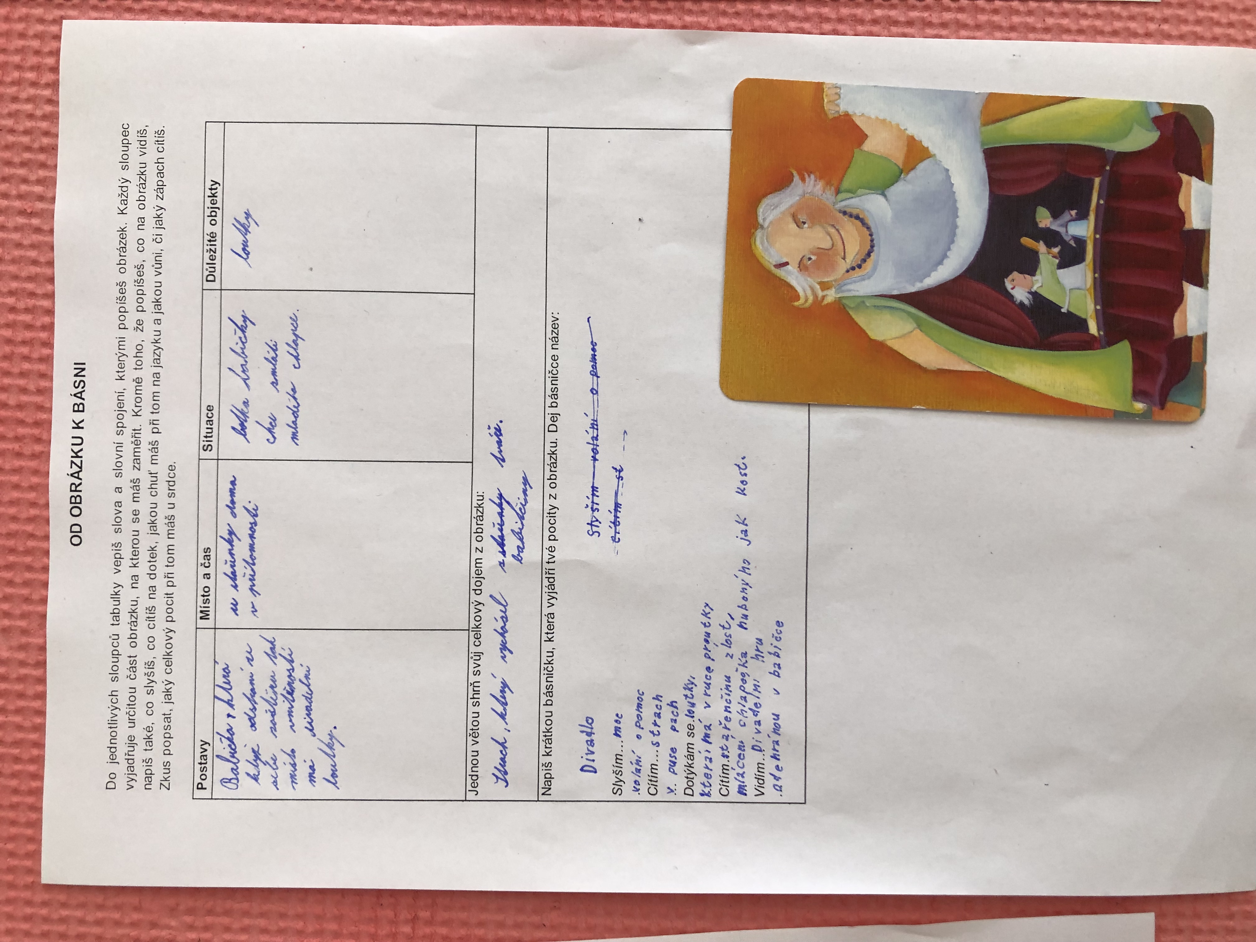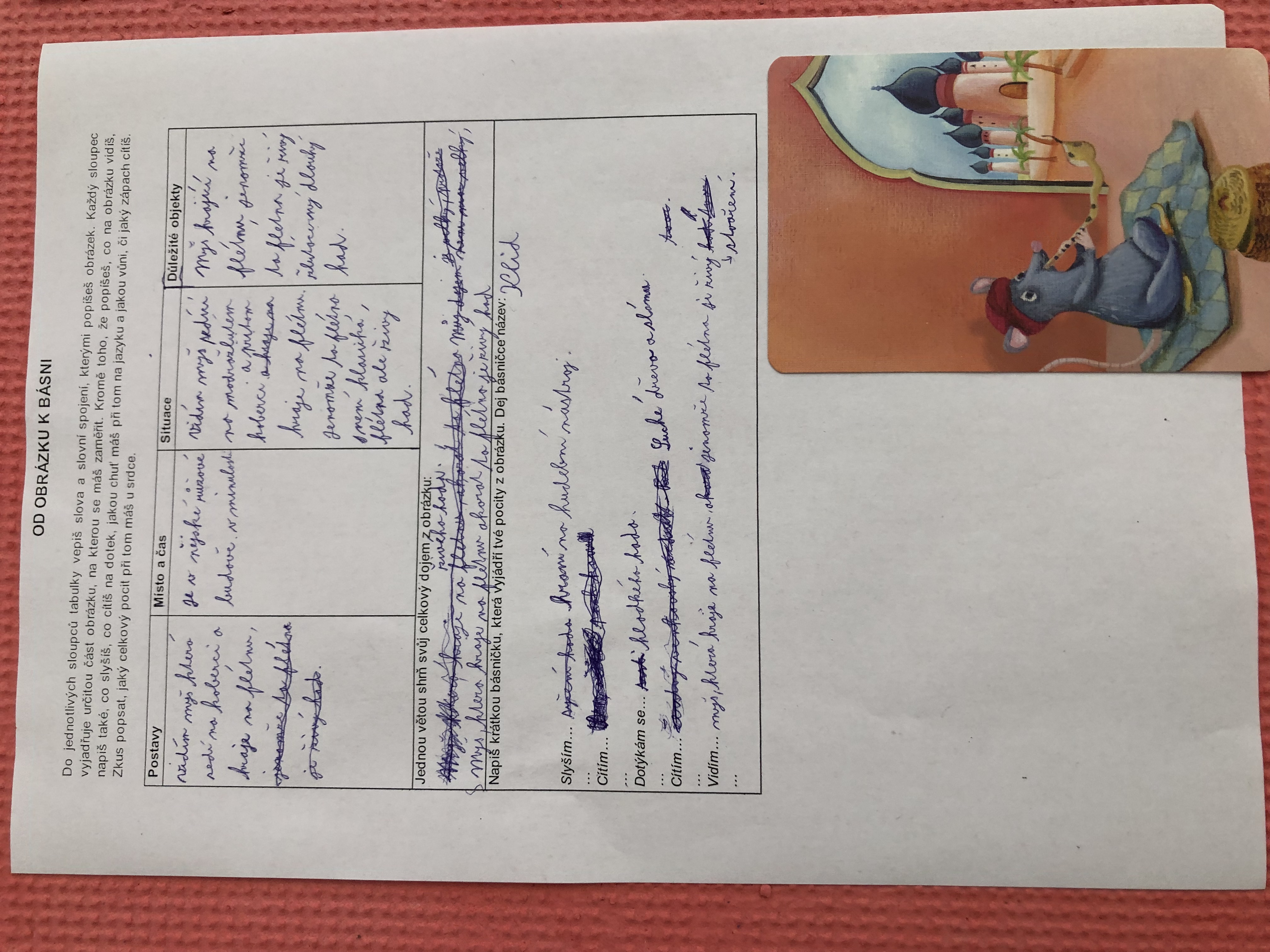 Nejen v dílně psaní děti píšou své texty, pisatelství se věnujeme i v dílnách čtení. Tentokrát se 7. B vydala na cestu od obrázku k básni. Každý si vylosoval obrázek a pokusil se zapojit všechny smysly: Postupně popsal jednotlivé části obrázku, představy si zapisoval do tabulky. Přemýšlel, jaký dojem v něm vyvolává, myšlenky zformuloval do věty. Následně vznikly krátké básničky...