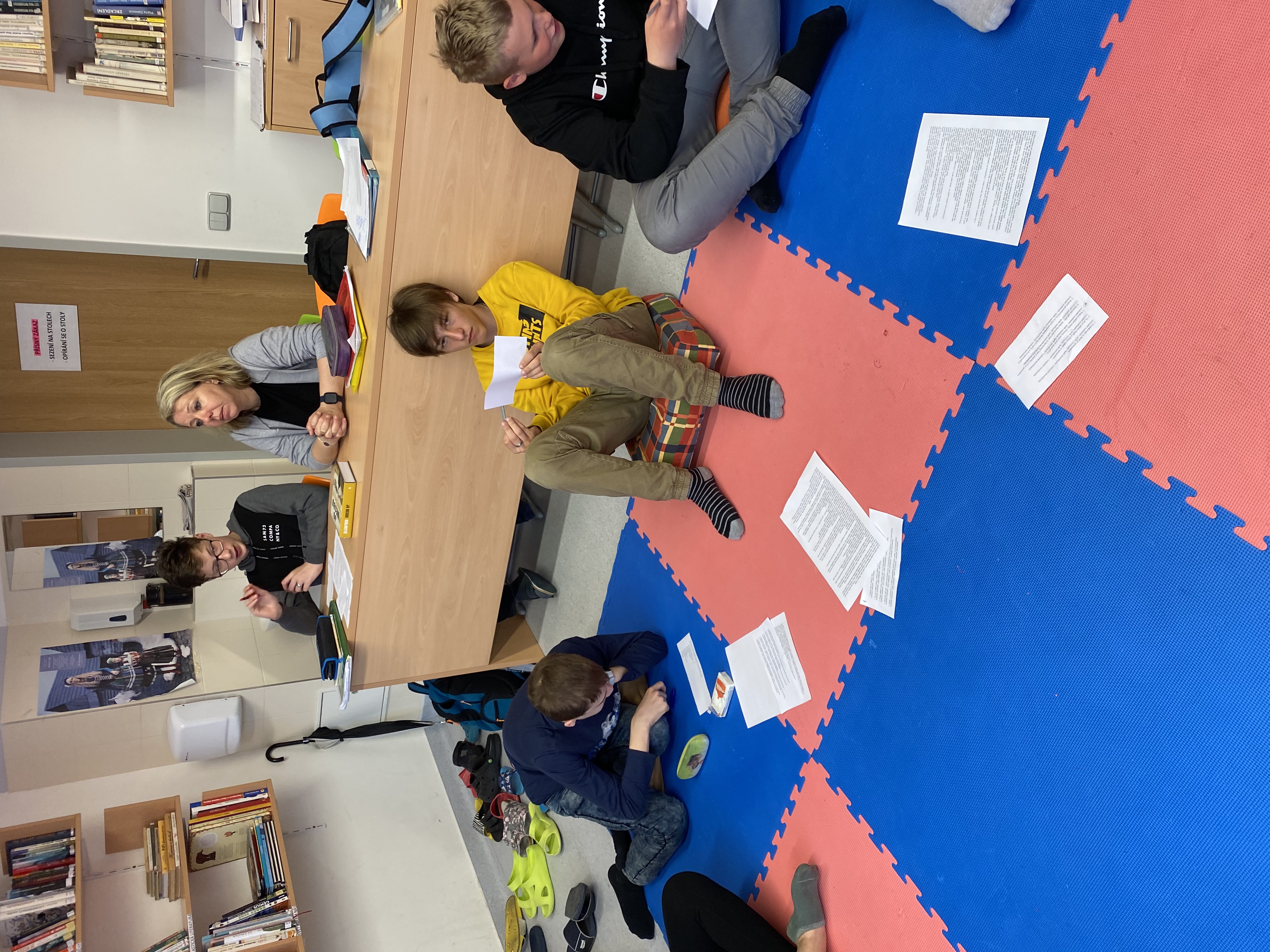 Ve dvouhodinovém bloku žáci 8. A a 6. B pokládali otázky, hledali na ně odpovědi, vyjadřovali vlastní názor, argumentovali. Přemýšleli o spravedlnosti, možnosti volby, zodpovědnosti. Společně hledali řešení a „pravdu“. S lektorkou Markétou Knížkovou ze Šmidingerovy knihovny diskutovali, zda existuje nějaká univerzální pravda a odpověď na jakoukoli otázku. Příběh knihy Ďolík je dovedl k otázce vlastní zodpovědnosti, nastavení hranic, k otázce omezování a svobody.