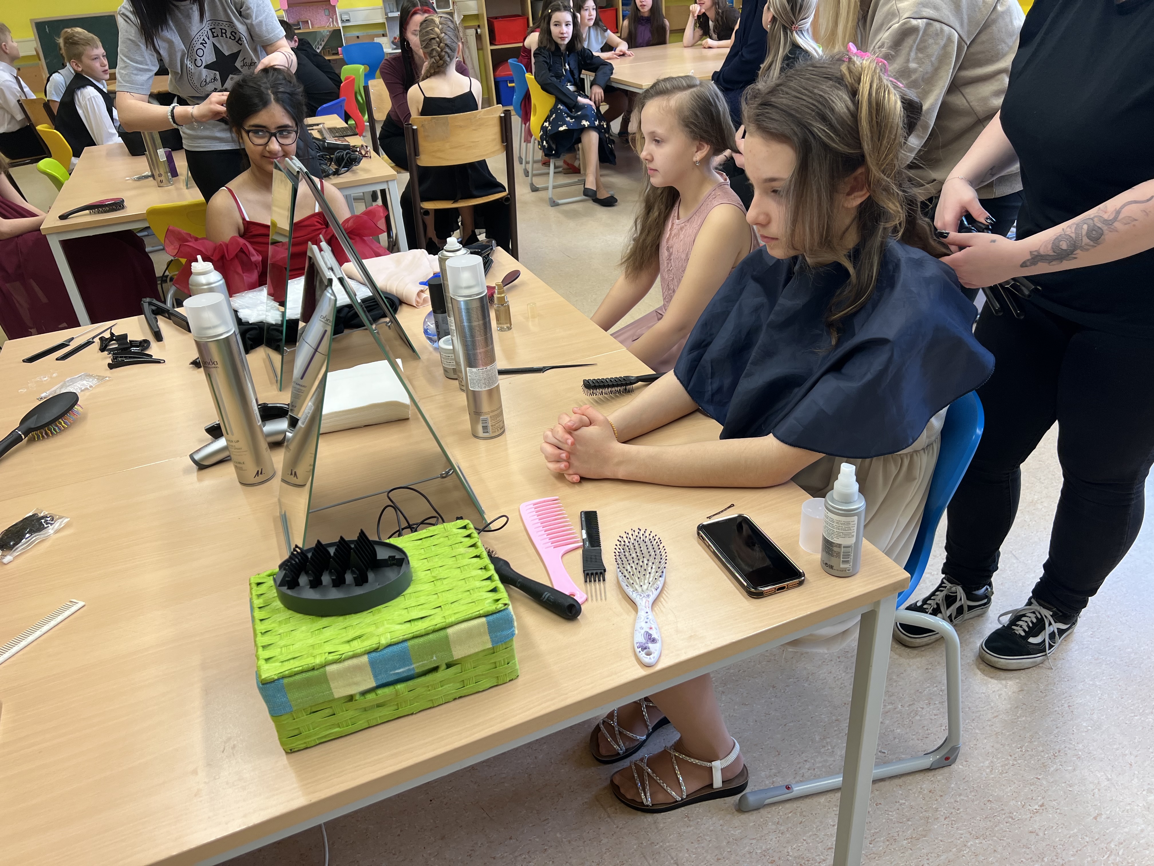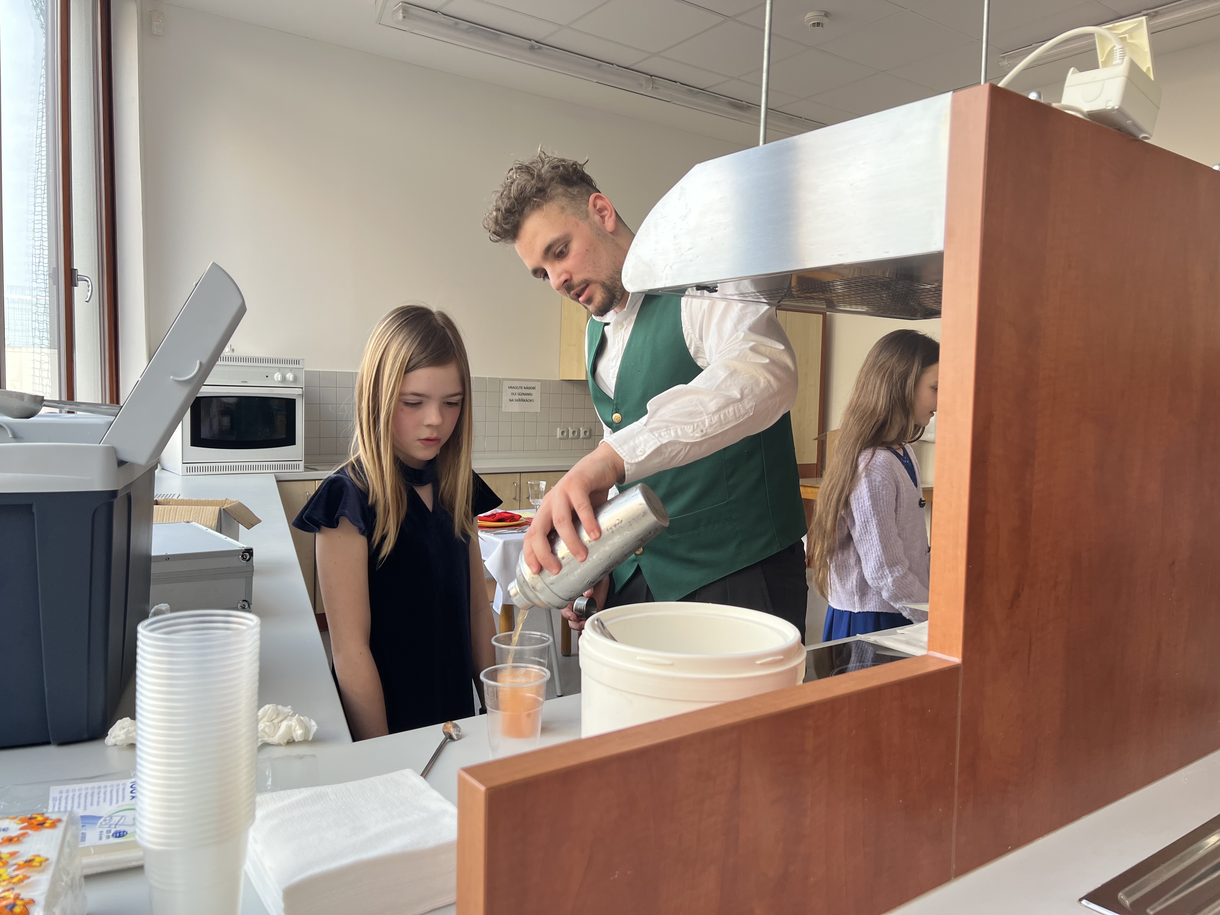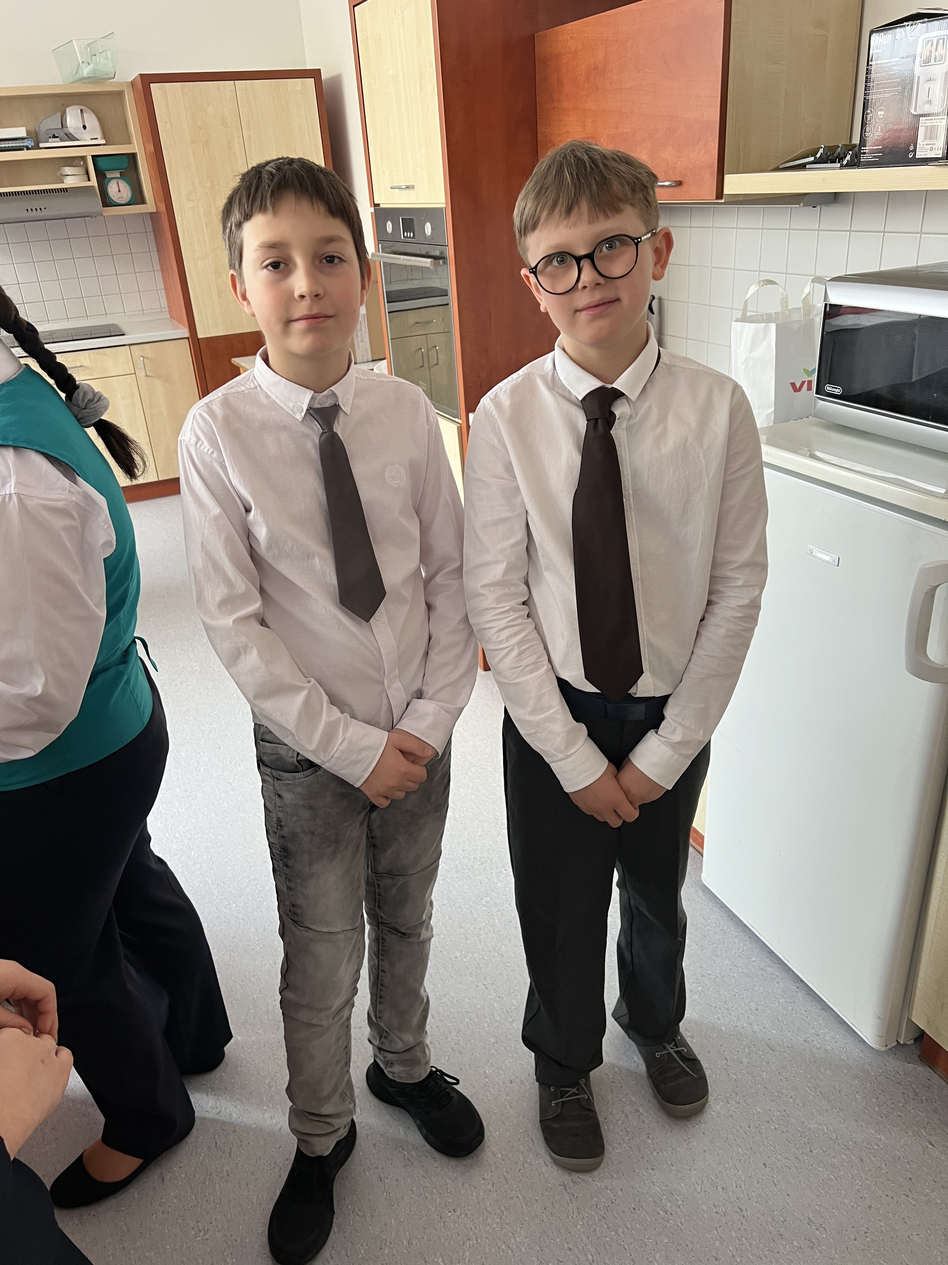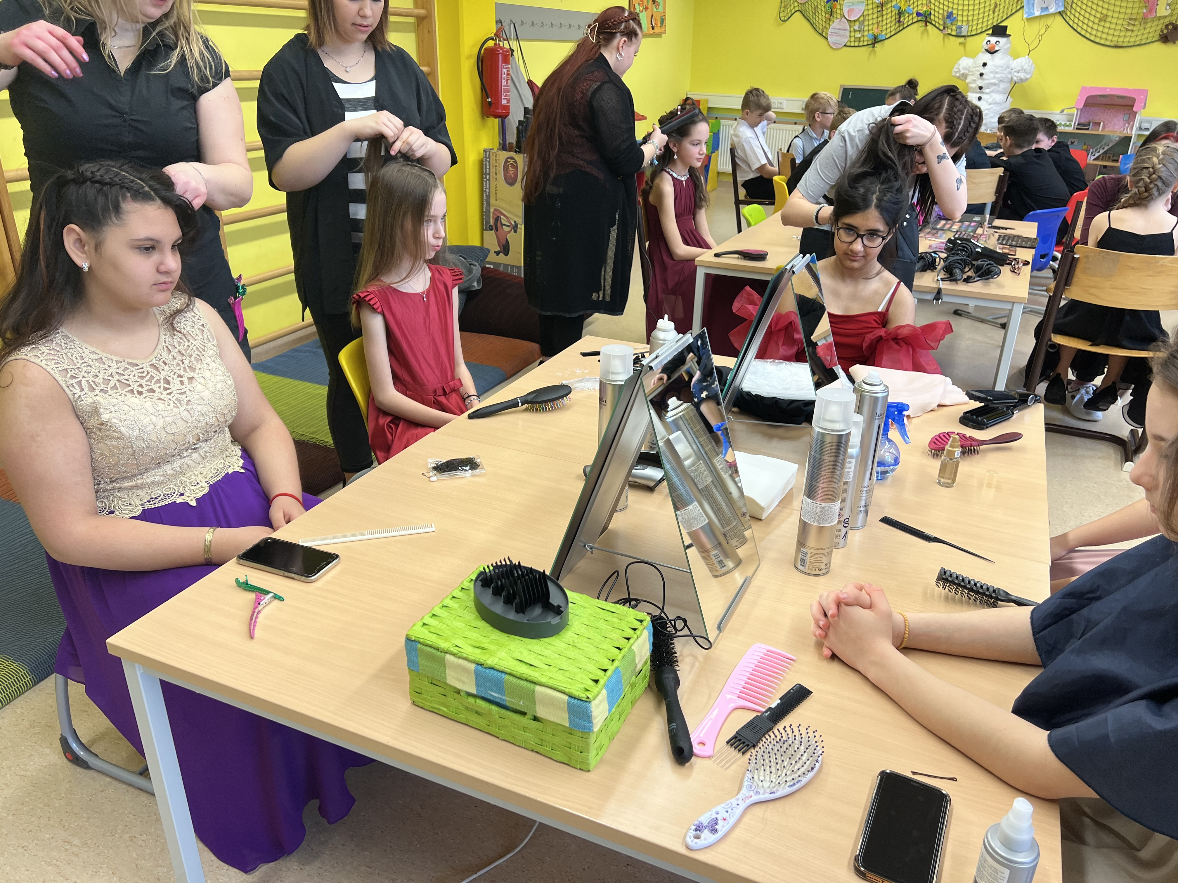 To, že škola nejsou jen předměty, které jsou zapsány v rozvrhu, se přesvědčily ve středu 12.4. děti z 5.A a 5.B. Při akci nazvané "Společenské dopoledne" se seznámily se základy etikety, správného stolování a základy společenských tanců. Velké poděkování patří studentům 3.ročníku SOU řemesel a služeb z oborů kuchař, číšník a kadeřnice a jejich mistrovým p.Cibulkové a p.Šmídové. Páťáci si dnes s jejich pomocí namíchali svůj první nápoj. Družina se proměnila v kadeřnický a kosmetický salon. Dále na ně čekal taneční lektor pan Houdek s naší žákyní Karolínou Šrotovou z osmé třídy, kterým patří také velké poděkování. Pod jejich vedením si děti zkusily hned několik společenských tanců. Doufáme, že se dětem společenské dopoledne líbilo.